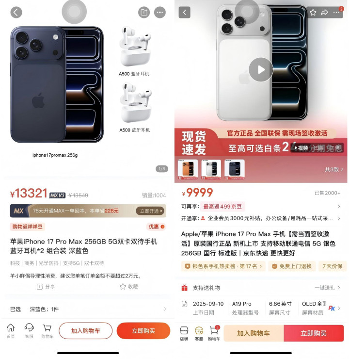 登录羊小咩APP可以发现,虽然这是一个电商购物类APP,但是商品价格要远高于市场价,以最新的深蓝色苹果17Promax256G本为例,京东APP的苹果产品京东自营旗舰店售价为9999元,而在羊小咩APP上,同款手机搭配两个蓝牙耳机的售价(优惠后)高达13321元。