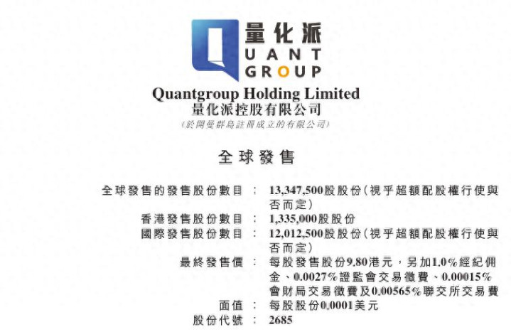11月27日,量化派(2685.HK)在香港上市。作为一家不到四年五次递表港交所的企业,量化派本次募资总额约1.31亿港元,所得款项净额为1237万港元。